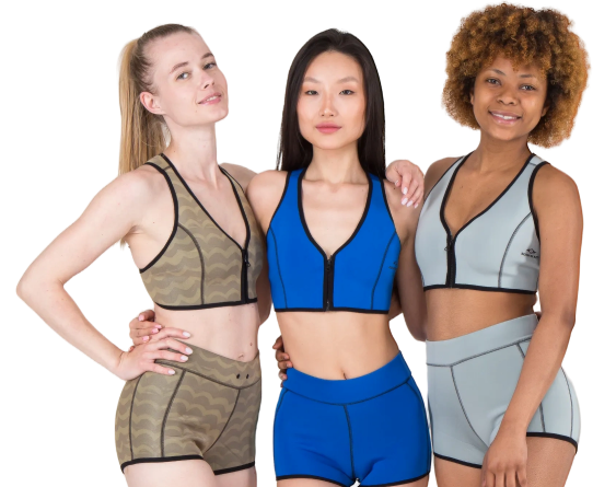 - гидрокостюмы собственного производства, изготовленные из различных материалов (нейлон, ультраспан, резина «открытая пора») и в широком диапазоне толщины – от 3 до 10 мм. Крой выполнен таким образом, чтобы специальная одежда плотно прилегала к телу и не сковывала движений пловца;
